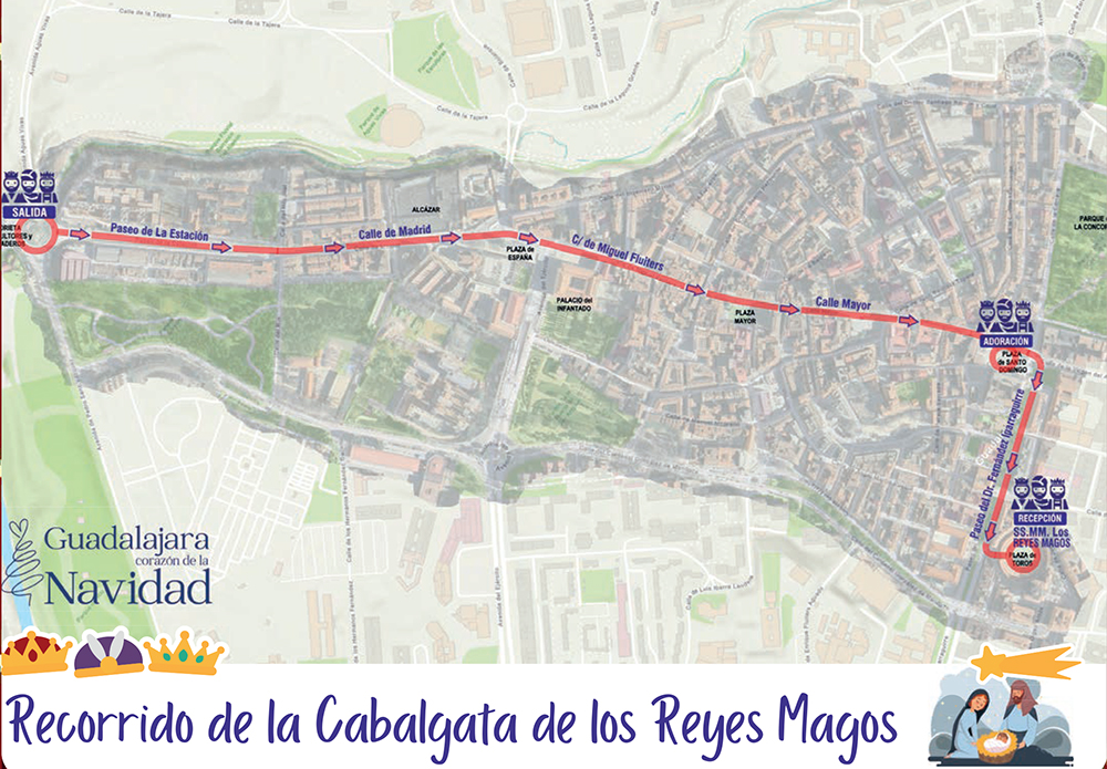 Salida desde el Paseo de la Estación, Calle Madrid, Plaza de España, C/ Miguel Fluiters, C/ Mayor y Plaza de Santo Domingo, donde los REYES MAGOS adoraran al NIÑO JESÚS en el MISTERIO VIVIENTE instalado en un Escenario en la explanada de San Ginés