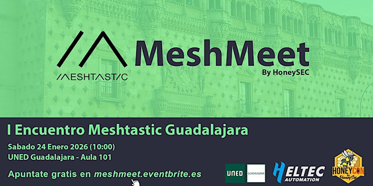 Guadalajara. Primer Encuentro Meshtastic Un evento pensado para explorar y expandir el uso de Meshtastic y LoRa Sábado 24 de enero de 2026, desde las 10,00 horas Centro Asociado de la UNED, Guadalajara Inscripciones en meshmeet.eventbrite.es